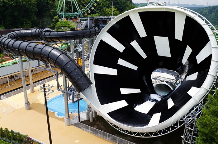 超级大喇叭滑梯(Big speaker slide,Tornado slide),最多可6人同时搭乘,整个过程紧张刺激迂回曲折,到最后游玩者直接坠入深渊的中心!是同时体验离心力与失重的最佳最受欢迎的设备。几乎所有大型水上乐园都会有超级大喇叭滑梯,除了给游客身心体验,同时也是一道靓丽与震撼的风景(景观)